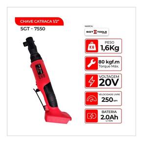 A SGT-7550 é uma chave catraca sem fio, alimentada por uma bateria de íons de lítio de 20V/2Ah. Com um torque máximo de 80Nm, é capaz de realizar trabalhos de aperto e desaperto em parafusos e porcas com facilidade. Possui uma empunhadura ergonômica emborrachada e um gatilho de velocidade variável para controle preciso. Acompanha uma bateria e um carregador de 1 hora, o que permite trabalhar por mais tempo sem interrupções. É um equipamento ideal para mecânicos, marceneiros, eletricistas e profissionais de manutenção em geral.