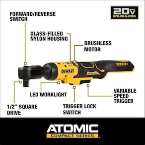 Chave catraca 1/2pol atomic 20v brushless dcf512b-b3 dewalt Dcf512b chave catraca atomic compact series 20v max 1/2 pol. somente ferramenta Projetada para desempenho e durabilidade, a catraca oferece controle de velocidade variável para ajudá-lo a enfrentar uma variedade de aplicações, enquanto a carcaça de nylon com fibra de vidro foi projetada para ajudar a evitar danos causados por solventes abrasivos e produtos químicos durante o trabalho. Seu design compacto ajuda a alcançar fixadores de difícil acesso e você pode manter um fluxo de trabalho estável e bem iluminado graças à luz de trabalho led integrada.Bateria e carregador não incluídos. Características adicionaisProjetado para alto torque e versatilidade: o motor sem escova oferece até 70 ft-lbs de torque para uso com uma ampla variedade de tamanhos e aplicações de fixadores Ajuda a combater os danos causados por alguns óleos e solventes com carcaça de nylon com fibra de vidro Ilumine os espaços de trabalho: com uma luz de trabalho led integrada que ajuda a iluminar os aplicativosAcesse locais de difícil alcance: design compacto e cabeçote de baixo perfil projetado para permitir mobilidade em locais apertados Controle de velocidade: o gatilho de velocidade variável ajuda o usuário a otimizar a velocidade com base na aplicação Compatibilidade sem fio: funciona com todas as baterias e carregadores dewalt 20v max bateria e carregador vendidos separadamente Trigger lock: ajuda a prevenir a ativação acidental quando aplicado Bateria e carregador vendidos separadamente Não achou o que procurava ou ficou com dúvidas em relação ao produto