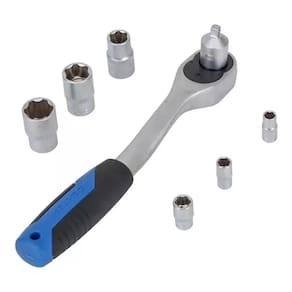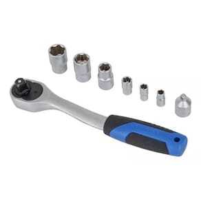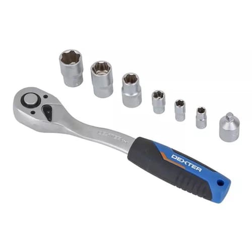 Jogo de Soquetes com Chave Catraca 8 Peças DexterO jogo de Soquetes Dexter é ideal para quem necessita apertar e desapertar porcas de tamanhos variados. Ele contém uma chave catraca que, quando usado com um soquete de 1/2", o mecanismo de catraca permite um rápido aperto e desaperto, uma vez que a chave não precisa ser reposicionada a cada volta.A presença da pequena alavanca giratória torna possível escolher a posição de aperto ou afrouxamento para um trabalho fácil e prático. Os 72 dentes da chave catraca permitem que o mecanismo seja operado com um ângulo de engate de 5 graus, facilitando o trabalho em áreas apertadas, garantindo produtividade sem perder tempo com o reposicionamento da chave.O cabo ergonômico é coberto com um revestimento antiderrapante para uma boa aderência e ótimo conforto de uso. Além disso, o aço cromo-vanádio oferece alta resistência e durabilidade.Ele acompanha:• 6 Soquetes Sextavados 1/2" (7,8,10,13,17 and 19mm)• 1 Chave Catraca 1/2";• 1 Adaptador de Soquete 1/2" para 3/8".