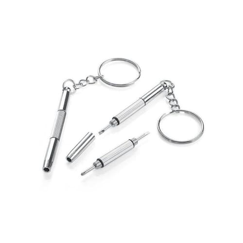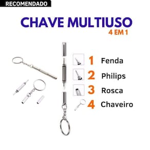 Chave 4 em 1 multi funções super útil no dia a dia Modelo Para óculos e armações Cor: Prata Material: Metal Funções: Fenda, philips e dois Tamanhos de porca
