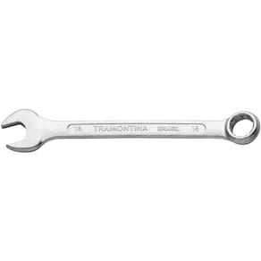 Com a Chave Combinada 14 mm Tramontina Basic com Corpo em Aço Especial Cromado você garante versatilidade em uma ferramenta super compacta! Ideal para apertar e afrouxar parafusos ou porcas com perfil quadrado ou sextavado, é produzida em aço especial com acabamento cromado, o que garante resistência e durabilidade à peça. Além disso, possui duas configurações: de um lado chave fixa e do outro chave estrela, o que a torna uma ferramenta super versátil. Garanta já a sua e complete sua caixa de ferramentas! Orientações Corpo forjado em aço especial e temperado.Acabamento cromado.Abertura das bocas calibradas.Pescoço curto.O teste de dureza é realizado em vários pontos para assegurar a resistência ao desgaste da chave durante o uso ininterrupto.As aberturas das bocas das chaves de aperto são verificadas com gabaritos calibrados, o que garante seu perfeito acoplamento nos parafusos.Alguns tipos de chaves de aperto são fornecidos em bitolas métricas e em polegadas, para o uso nos diversos fixadores disponíveis.As ferramentas são produzidas e testadas conforme normas específicas. Características Gerais EAN13 7891114063585 DUN14 17891114063582 NCM 8204.11.00 Peso Líquido 0,0900 kg. Peso Bruto 0,0900 kg. Metragem 0,000259 m³. Dimensões Embalagem (Compr. X Larg. X Alt.) 235x 55x 20 mm. Dimensões Produto (Compr. X Larg. X Alt.) 175x 32x 10 mm. Dimensão Extra A 5,8 mm. Dimensão Extra B 175,0 mm. Dimensão Extra C 10,0 mm. Dimensão Extra D 32,0 mm. Observações Use óculos, luvas e outros equipamentos de proteção de acordo com a tarefa a ser executada. Não golpeie as chaves, a não ser que sejam projetadas para este fim. Sempre utilize uma chave de bitola correta para cada parafuso ou porca para que não haja folga, pois isso danifica a chave e o parafuso. Mantenha a chave limpa para um melhor agarre, pois usá-la suja com graxa ou óleo pode causar acidentes. Não use tubos ou extensões para obter mais torque. Não altere a forma original das chaves. Armazene em local limpo e seco.