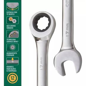 Chave combinada com catraca de qualidade profissional superior, com 72 posições que proporcionam um arco de giro de apenas 5, ideal para espaços de difícil alcance ou apertados. Ferramenta duas em uma, possui chave de boca de um lado e chave estrela com catraca do outro, equipada com tecnologia Surface Drive, que abraça o parafuso ou a porca com mais segurança, facilitando apertar ou desapertar sem muito esforço, mesmo em situações complicadas.