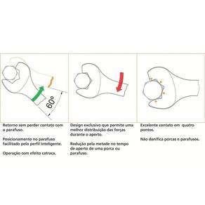 Cabeça usinada. Acabamento cromado. Catraca fosfatizada. Abertura da boca calibrada. 60 dentes. As chaves de aperto são produzidas em aço ligado com cromo vanádio (Cr-V), e após submetidas a testes rigorosos de torque para atender a norma DIN 1711-1. O teste de dureza é realizado em vários pontos para assegurar a resistência ao desgaste da chave durante o uso ininterrupto. Afrouxar e apertar parafusos e porcas sextavadas e quadradas. Sua forma construtiva permite apertar parafusos e porcas sem precisar tirar a chave para encaixá-la a cada movimento, o mesmo acontece se inverter a chave para afrouxar. Lado estrela possui mecanismo com catraca que permite realizar trabalhos com mais agilidade e facilidade do que uma chave estrela comum. Catraca com construção robusta que permite dar apertos finais conforme DIN-ISO 1711-1. As ferramentas são produzidas e testadas conforme normas específicas.