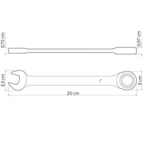 Forjada em aço cromo vanádio e temperada. Catraca com 90 dentes. Cabeça usinada. Acabamento cromado. Catraca fosfatizada. DIN 3113. Tamanho: 15 mm