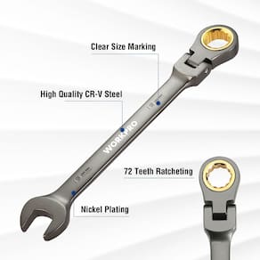 WORKPRO Chave combinada de catraca de cabeça flexível de 19 mm, construção Cr-V, revestimento de níquel, 72 dentes, design de 12 pontos, métrico - Resistente e duradoura: nossas chaves inglesas são feitas de liga Cr-V tratada termicamente de alta qualidade e niqueladas para maior durabilidade. A rotação flexível é conveniente para operação em pequenos espaços e operação sem esforço - Facilita o trabalho: a catraca de 72 dentes garante que o arco de giro de cinco graus funcione, permitindo uma operação fácil e rápida - A chave tem cerca de 24,4 cm de comprimento. A extremidade da caixa de catraca universal cabe em quatro, seis, 12 pontos, estrias, torx externo e até mesmo fixadores arredondados - Perfeito para trabalhar em espaços apertados: a cabeça da extremidade da caixa é usinada com precisão para encaixar firmemente nos fixadores. Também pode ser girado 180 graus para acessar espaços apertados - Ampla aplicação: adequado para fixar ou afrouxar porcas e parafusos em espaços estreitos. Aplicável a projetos domésticos, trabalhos de garagem, reparos de automóveis, serviços de caminhão, encanamento, construções, máquinas e muito mais
