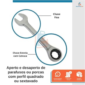 A Chave combinada com catraca é ideal para aperto e desaperto de parafusos ou porcas com perfil quadrado ou sextavado. Fabricado em aço carbono oferece durabilidade e resistência, para funcionamento adequado é necessário usar a chave de tamanho compatível com a cabeça da porca ou parafuso.Orientações gerais:- Use óculos, luvas e outros equipamentos de proteção de acordo com a tarefa a ser executada;- Não golpeie as chaves, a não ser que sejam projetadas para este fim;- Sempre utilize uma chave de bitola correta para cada parafuso ou porca para que não haja folga, pois isso danifica a chave e o parafuso;- Mantenha a chave limpa para um melhor agarre, pois usá-la suja com graxa ou óleo pode causar acidentes;- Não use tubos ou extensões para obter mais torque;- Não altere a forma original das chaves;- Armazene em local limpo e seco.Características técnicas:Material: Aço carbono níquel-cromadoMedidas: 17mmQuantidade: 1 unidadeTipo de chave: CombinadoMarca: StarferRef.: 3501698