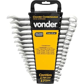Marca: VonderConteúdo da embalagem:1 Jogo de chaves combinadass, composto por um suporte plástico com 17 peças, sendo: 6 mm, 7 mm, 8 mm, 9 mm, 10 mm, 11 mm, 12 mm, 13 mm, 14 mm, 15 mm, 16 mm, 17 mm, 18 mm, 19 mm, 20 mm, 21 mm e 22 mm.Destaques e diferenciais:Possui acabamento cromado fosco, proporcionando maior resistência contra oxidação/corrosão. Combina na mesma chave um lado fixa e outro estrela, possibilitando aplicações em locais de difícil acesso.Aplicações e dicas de uso:Indicado para apertar e soltar porcas e parafusos sextavados. Nunca utilizar prolongadores sobre as chaves, pois isso aumentará o torque aplicado e diminuirá a vida útil das ferramentas. Uso industrial.Detalhes TécnicosMaterial : Aço cromo vanádio Acabamento: Cromado fosco Quantidade de peças: 17 peças Capacidade: 6 mm a 22 mm Norma DIN: DIN 3113 Massa aproximada peso kg : 1.62 Garantia - E CDC :Garantia legal: 90 dias
