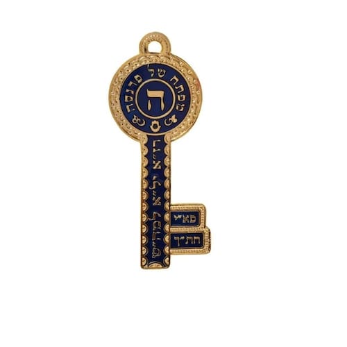 Chave de metal dourada esmaltada azul, escrito em hebraico, Mafteach Shel Parnassá prosperidade/sustento na parte superior.