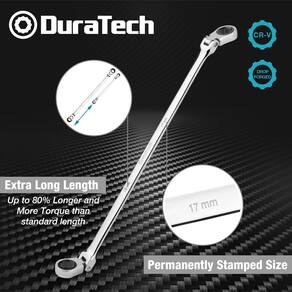 DURATECH Chave catraca de cabeça flexível extralonga de 17 x 19 mm, aço CR-V - Chave de extremidade de caixa de cabeça flexível extra longa de 17 × 19 mm. Comprimento total da chave 41 cm (16,14 polegadas) - Feito de aço cromo vanádio premium, tratado termicamente para máxima resistência e durabilidade. O design ultra-longo exclusivo pode aumentar o torque, o que é mais fácil e economiza mais trabalho do que outras chaves de caixa no mercado - Dois tamanhos convenientes permitem que você aperte ou afrouxe facilmente mais parafusos simplesmente virando a chave. É conveniente trabalhar em um espaço estreito. O mecanismo de catraca na extremidade da caixa permite que você gire fixadores sem remover e reposicionar a chave inglesa - A engrenagem catraca de 72 dentes precisa de um mínimo de arcos de giro de 5 graus, perfeitos para espaços de trabalho restritos e difíceis de alcançar. As cabeças flexíveis de rotação de 180 graus permitem que você aplique alavancagem em qualquer ângulo desejado e contorne obstruções ótimas para design de espaços apertados - Ideal para entrar em locais apertados. Design prático, amplamente aplicável em indústrias como reparo e manutenção de veículos, máquinas, energia elétrica e uso doméstico, tornando-o ultra versátil para uma variedade de tarefas e trabalhos