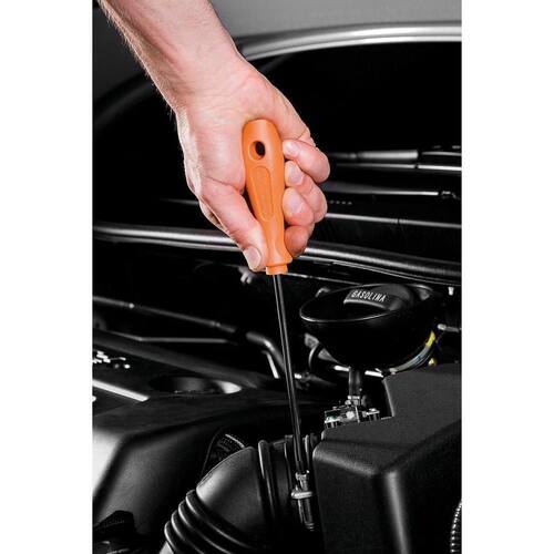 Chave de Fenda Ponta Chata em Aço Cromo Vanadio 3x125 mm 1/8x5 Tramontina PRO Haste em aço cromo vanádio temperada.Acabamento cromado.Ponta fosfatizada e magnetizada.Cabo injetado.DIN ISO 2380.Ponta chata.As hastes das chaves de fenda são testadas em máquina de ensaio específica, para verificar o perfeito balanço entre resistência mecânica e dureza.Os dimensionais das pontas são verificados com gabaritos-padrão calibrados e certificados, e a qualidade do fosfato é inspecionada ao microscópio.Apertar ou afrouxar parafusos de fenda simples.As ferramentas são produzidas e testadas conforme normas específicas. Seja em manutenções industriais ou automotivas, apertar ou afrouxar parafusos se torna mais fácil com a ajuda da Chave Twister da Tramontina PRO. Esta chave de fenda proporciona maior conforto e firmeza na utilização, devido as suas saliências no cabo. Ideal para trabalhos em locais de difícil acesso, aschaves estão disponíveis em ponta chata e cruzada, nos modelos tradicional e toco. É mais uma inovação que compõe a linha de ferramentas industriais da Tramontina PRO. Agilidade e eficiência: características de quem é PRO. Ean: 7891114069624