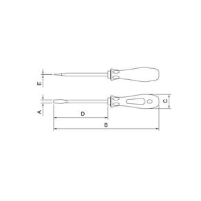 Haste em aço cromo vanádio temperada. Acabamento cromado. Ponta fosfatizada e magnetizada. Cabo injetado. DIN ISO 2380. Ponta chata. As hastes das chaves de fenda são testadas em máquina de ensaio específica, para verificar o perfeito balanço entre resistência mecânica e dureza. Os dimensionais das pontas são verificados com gabaritos-padrão calibrados e certificados, e a qualidade do fosfato é inspecionada ao microscópio. Apertar ou afrouxar parafusos de fenda simples. As ferramentas são produzidas e testadas conforme normas específicas.