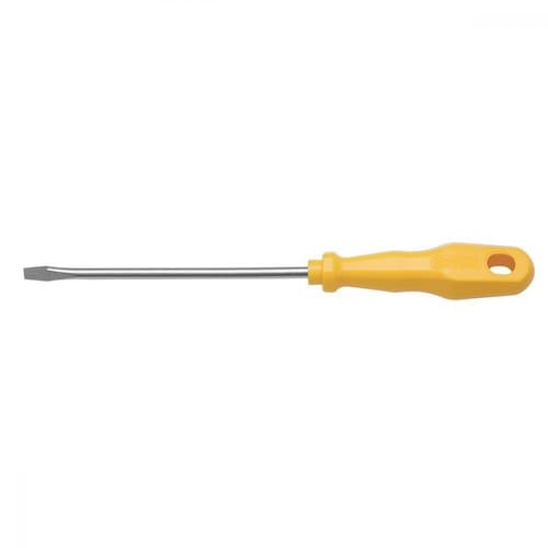 Haste em aço especial temperado. Acabamento niquelado. Ponta chata. As hastes as chaves de fenda são testadas em máquinas de ensaio específicas, para verificar o perfeito balanço entre resistência mecânica e dureza. Cabos injetados com material de alta resistência. Os dimensionais das pontas são verificados com gabaritos-padrão, calibrados e certificados. As ferramentas são produzidas e testadas conforme normas específicas.