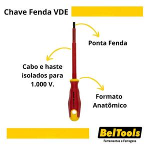 Descrição: - Atende norma internacional EN/IEC 60900:2004. - Cabo e haste isolados para 1.000 V. - Testada individualmente. - Com formato anatômico que proporciona melhor manuseio.