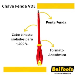 Descrição: - Atende norma internacional EN/IEC 60900:2004. - Cabo e haste isolados para 1.000 V. - Testada individualmente. - Com formato anatômico que proporciona melhor manuseio.