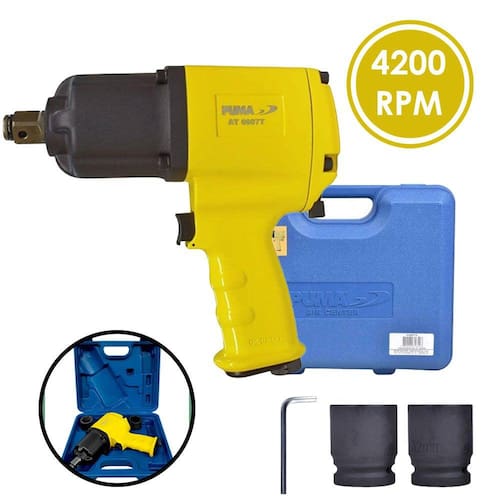 - Marca : PUMA - Referência : AT6607TK - Encaixe :3/4" - Entr. de Ar: 3/8" (F) - Rosca: Até 7/8" - Velocidade: 4.200 RPM - Torque de Trab.: 120 KGFM - Peso: 4,8 kg - Soquetes que Acompanham :32, 33 - Cons. de Ar Inst.: 0,79 PCS ou 22,42 L/seg - Pressão de Trab.: 90 psi