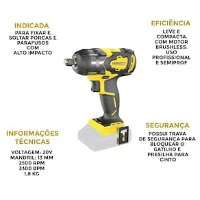 Bateria intercambiável: 20v - lítio - bivolt; Torque máximo: 350 n.M.; Possui led: sim; Mandril de encaixe: 1/2; Velocidade mecânica: 0 - 2500 rpm; Impacto: 0 - 3300 bpm; Peso: 1,10kg Motor: brushless; Dimensões c x l x a : 16 x 8 x 18,5 Garantia: 6 meses.