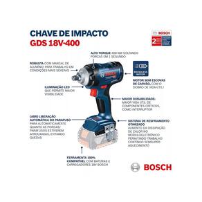 A Chave de Impacto Bosch GDS 18V-400 possui alto torque de 400Nm e motor Brushless (sem escovas de carvão), livre de manutenção, com o dobro de vida útil. Essa ferramenta é robusta, com mancal de alumínio para trabalhos em condições severas. A Chave de Impacto Bosch GDS 18V-400 possui uma nova tecnologia em Chaves de Impacto chamada "ABR - Auto Bolt Release" ou "Liberação automática do parafuso", que aumenta a produtividade da ferramenta durante aplicações de desmontagem, garantindo que a ferramenta pare automaticamente de funcionar quando as porcas já estiverem afrouxadas; evitando assim, a queda das porcas e parafusos. Ferramenta 100% compatível com todas as baterias e carregadores Bosch 18V! Esta versão vem com 2 Baterias 18V 4,0Ah e carregador, em maleta.
