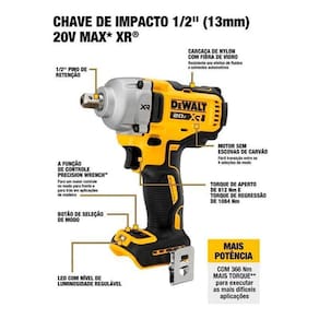 Chave de impacto, encaixe de 1/2, sem bateria e sem carregador, DCF892B-B3, DEWALTReferência: DCF892B-B3Conteúdo da embalagem: 1 Chave de impacto.Aplicações/dicas de uso: Indicada para fixar e soltar porcas e parafusos.Destaques/diferenciais características : Projetada para ajudar a evitar o aperto excessivo na frente e o escoamento na ré. Com 4 configurações de velocidade e um gatilho de velocidade variável. Possui luz de trabalho LED, para iluminar ambientes de trabalho com baixa luminosidade.Massa aproximada peso kg : 1,7 kgGarantia - E CDC Garantia legal: 90 dias + Garantia contratual: 33 mesesModelo: DCF892B-B3Encaixe: 1/2Bateria: Não acompanhaSistema de reversão: SimTipo de velocidade Variável 4 velocidades Tensão do carregador de bateria: Não acompanhaRotações por minuto rpm /min : 0 - 2.000/minimpactos por minuto ipm /min : 0 - 3.250/mintorque máximo N.M : 812 N.Mluz de LED: SimTensão V : Sem Bateria