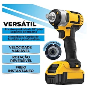 Conheça sua Chave de Impacto profissional, com duas baterias e maleta para transporte. Acompanha todos os itens necessários para utilizar sua ferramenta da melhor forma possível, como jogo completo de soquetes, mandril, brocas e muito mais. Informações Técnicas: Encaixe: 1/2 Led de iluminação durante o uso Sem carga rpm /min : 0-1700/0-2300 Impacto /min : 0-2600/0-3100 Torque Nm : 180/320 Tipo bateria: Lítio Carregamento por fonte bivolt Tensão de bateria V : 48v 10000 mAh Itens Inclusos: 1x Parafusadeira 2x Baterias 48v 1x Carregador bivolt 1x Adaptador com rosca para mandril 1x Mandril 1x Adaptador para pontas de bits 1x Bits com ponteira fenda/philips 2x Brocas 6x Soquete de impacto em mm: 22mm, 21mm, 20mm, 19mm, 18mm, 17mm 1x Maleta de transporte 1x de lubrificação Marca: Não Informado Ean: 7891580128719