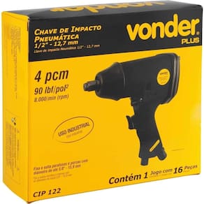 Conteúdo da embalagem: 1 Chave de impacto. Acompanha: 1 maleta plástica, 10 soquetes em aço cromo vanádio com encaixe de 1/2 (9 mm, 10 mm, 11 mm, 13 mm, 14 mm, 17 mm, 19 mm, 22 mm, 24 mm e 27 mm), 1 extensão 5 com encaixe de 1/2, 1 minilubrificador, 1 conector de engate rápido macho e 1 chave allen.
