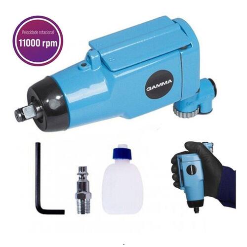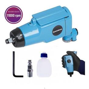 - Marca: GAMMA - Referência: G1180/BR - Consumo de ar aprox: 82,1 L/min - Encaixe: 3/8 “ - Pressão de trabalho: 6,3 Bar/90 L/pol² - Torque máximo: 102 N.m /75 L/pé - Vibração: Rotação: 2,8 m/s² - Rotação: 11.000 rpm - Capacidade para soquete: 10mm/3/8" - Diâmetro da rosca de entrada: 1/4" - Diâmetro interno da mangueira: 3/8" - Nível de pressão sonora: 92,6 dB (A) - Nível de potência sonora: 103,6 dB (A) - Dimensões aproximadas (CxLxA): 17 x 5,5 x 10 cm - Peso: 0,9 kg