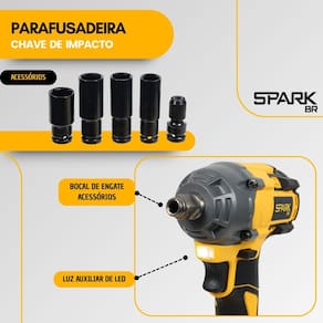 Se você procura potência, praticidade e versatilidade em uma única ferramenta, a Parafusadeira/Chave de Impacto Spark BR é a escolha ideal. Projetada para uso intenso e doméstico, ela combina desempenho e portabilidade, oferecendo mais eficiência em montagens, instalações, fixações e reparos em geral.