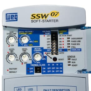 Chave de partida soft starter weg ssw07 30a 220v 380v 440v 525v 575v softstarters são chaves de partida estática, projetadas para a aceleração, desaceleração e proteção de motores elétricos de indução trifásicos, através do controle da tensão aplicada ao motor. as softstarters weg ssw07 e ssw08 foram desenvolvidas com controle dsp (digital signal processor), projetadas para garantir a melhor performance na partida e parada de motores de indução, sendo uma solução completa com excelente custobenefício. a interfacehomemmáquina (ihm) incorporada permite ajustes e configuração de forma fácil e rápida. também é possível adicionar ihm remota, interface de comunicação ou entrada para ptc de motor. desenvolvidas para uso industrial ou profissional, as softstarters ssw07 e ssw08 são compactas e possuem bypass incorporado, contribuindo assim para o aumento da vida útil do acionamento, otimização de espaço e menor dissipação de calor em painéis elétricos. as softstarters ssw07 e ssw08 são equipadas com as mesmas funcionalidades, sendo que a ssw07 é recomendada para acionamento de cargas pesadas, enquanto a ssw08 para cargas leve a moderadas.
