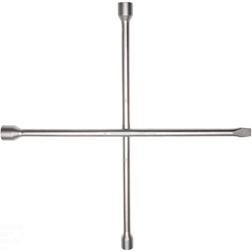 A Chave de Roda Tipo Cruz Tramontina com Corpo Forjado em Aço Especial Cromado 17x19x21 mm com Espátula é a ferramenta que não pode faltar no porta-malas do seu carro. Essa ferramenta produzida com corpo forjado em aço especial cromado vai lhe auxiliar a trocar pneus com muito mais facilidade, pois suas quatro extremidades acomodam uma grande variedade de tamanhos de porcas com olhal. Ela é altamente durável, resistente e ainda fácil de utilizar, sendo indispensável para você! Orientações Corpo forjado em aço especial e temperado.Acabamento cromado.Abertura das bocas calibradas.O teste de dureza é realizado em vários pontos para assegurar a resistência ao desgaste da chave durante o uso ininterrupto.As aberturas das bocas das chaves de aperto são verificadas com gabaritos calibrados, o que garante seu perfeito acoplamento nos parafusos.Alguns tipos de chaves de aperto são fornecidos em bitolas métricas e em polegadas, para o uso nos diversos fixadores disponíveis.As ferramentas são produzidas e testadas conforme normas específicas. Características Gerais EAN13 7891114015959 DUN14 17891114015956 NCM 8204.11.00 Peso Líquido 1,1300 kg. Peso Bruto 1,1300 kg. Metragem 0,003812 m³. Dimensões Embalagem (Compr. X Larg. X Alt.) 330x 330x 35 mm. Dimensões Produto (Compr. X Larg. X Alt.) 440x 29x 440 mm. Dimensão Extra A 27,2 mm. Dimensão Extra B 500,0 mm. Dimensão Extra C 29,2 mm. Dimensão Extra D 31,7 mm. Dimensão Extra E 16,0 mm. Dimensão Extra F 16,0 mm. Observações Use óculos, luvas e outros equipamentos de proteção de acordo com a tarefa a ser executada. Não golpeie as chaves, a não ser que sejam projetadas para este fim. Sempre utilize uma chave de bitola correta para cada parafuso ou porca para que não haja folga, pois isso danifica a chave e o parafuso. Mantenha a chave limpa para um melhor agarre, pois usá-la suja com graxa ou óleo pode causar acidentes. Não use tubos ou extensões para obter mais torque. Não altere a forma original das chaves. Armazene em local limpo e seco.