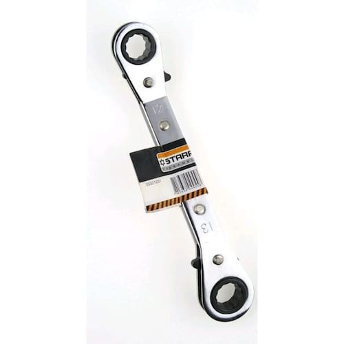 Chave estrela com catraca em aço carbono cromada com aberturas 12mm e 13mm.
