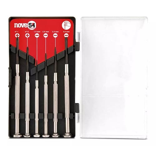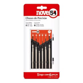 1 jogo de chaves fenda/phillips de precisão, composto por estojo plástico com 6 peças, na cor vermelho e preto, sendo: 4 fenda 1,4 mm, 2,0 mm, 2,4 mm e 3,0 mm e 2 phillips nº 0 - 1/8 e n° 1 - 3/16 Indicado para relojoarias, eletrônicas, serviços de precisão, entre outros Possui haste em aço cromado, ranhuras que conferem maior aderência e transmissão de força, ponta em aço temperado de alta resistência e apoio superior giratório que facilita a execução do trabalho. Ean: 7893946383695