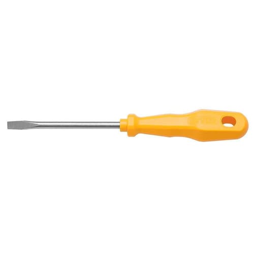 A cor amarela vibrante não só adiciona um toque de estilo, mas também facilita a identificação da ferramenta em um ambiente de trabalho movimentado. A haste em aço especial temperado é meticulosamente projetada para resistir às mais severas condições, enquanto o acabamento niquelado não apenas confere uma aparência profissional, mas também protege a chave de fenda contra corrosão e desgaste prematuro.