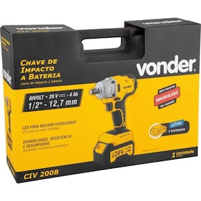 A Chave de Impacto CIV 200B da Vonder é a ferramenta ideal para quem busca eficiência e praticidade em trabalhos de fixação e desaperto de parafusos e porcas. Com bateria de 20V e torque máximo de 450 N.m para desaperto, esta chave garante força e desempenho superiores, mesmo em aplicações mais exigentes. Seu sistema de reversão e velocidade variável proporcionam maior controle e versatilidade, adaptando-se a diferentes tipos de trabalhos. O design ergonômico, com cabo emborrachado, oferece conforto durante o uso prolongado, enquanto a luz de LED integrada ilumina a área de trabalho, garantindo visibilidade em ambientes com pouca luz. A tecnologia Brushless (sem escova de carvão) aumenta a durabilidade e a eficiência do motor, reduzindo a necessidade de manutenção. Acompanha duas baterias de 4Ah, fonte bivolt automática e maleta plástica para transporte e armazenamento seguros. Invista na Chave de Impacto Vonder e eleve a qualidade e a produtividade dos seus projetos!