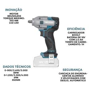 Chave impacto 18v wesco ws2407 brush + jogo soquetes 8 pçs Chave de impacto wesco, modelo ws2407, com bateria, carregador E jogo de soquetes de 8 peças Chave de impacto 18v com motor brushless de 1/2 - 350 nm Excelente performance e custo-benefício. Dados técnicos Motor brushless; Mandril de 1/2 quadrado; Velocidade variável e reversível; Carcaça de engrenagem de alumínio; 3 velocidades com deslig. Automático; Luz led. Tipo de bateria: 18v; Rotação: 0-900/2.400/3.000 rpm; Impactos por minuto: 0-1.200/3.300/4.000 ipm; Torque máximo: 350 nm; Tamanho do mandril: 1/2 quadrado; Voltagem: bivolt; Tempo de carregamento: 1h; Peso: 1,1 kg Itens que acompanham a máquina: -01 bateria de 18v com 2.0 ah; -01 carregador - bivolt; -03 soquetes de 17mm, 19mm e 21mm ; -01 clip de cinto; -01 jogo de soquetes com 8 peças: Jogo de soquetes de impacto sextavados, Encaixe de 1/2, 10,0 mm a 24,0 mm, com 8 peças, Vonder30.61.008.012 Conteúdo da embalagem: 1 jogo de soquetes composto por 8 peças, sendo: soquetes sextavado 1/2 10,0 mm, 12,0 mm, 13,0 mm, 14,0 mm, 17,0 mm, 19,0 mm, 21,0 mm, 24,0 mm . Acompanha maleta plástica. Produzido em aço cromo molibdênio, que confere maior resistência e durabilidade, e acabamento fosfatizado, proporcionando maior resistência à oxidação/corrosão. Indicado para apertar e soltar porcas e parafusos sextavados. Utilizado em chaves de impacto pneumáticas e elétricas. legal: 90 dias