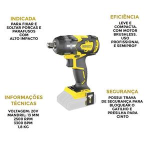 Chave impacto a bat mci-21 20v menegotti + 2 bat e carreg Chave de impacto a bateria 20v intercambiável mci-21 com motor brushless menegotti + 02 baterias 4,0ah e carregador Os modelos intercambiáveis da menegotti chegaram, trazendo muitas novidades. São ferramentas incríveis, com design exclusivo e tecnologia de última geração. As ferramentas intercambiáveis da menegotti contam com o motor brushless, aquele que não possui escova e possui baixo custo de manutenção. O que é intercambiável É a tecnologia que proporciona a troca de ferramentas, utilizando a mesma bateria. A chave de impacto a bateria de 20v com bateria intercambiável é uma ferramenta portátil que usa energia de uma bateria recarregável de 20v. Ela é eficiente Para apertar e soltar parafusos e porcas com alto torque. Sendo sem fio, proporciona mobilidade e fácil acesso a locais de difícil alcance. Com luz led e controle De velocidade, é uma opção versátil para diversas aplicações. Principais características: Cabo com revestimento emborrachado. Motor brushless, sem escova de carvão. Uso semiprofissional, . Dados técnicos: Bateria intercambiável: 20v - lítio - bivolt; Torque máximo: 350 n.M.; Possui led: sim; Mandril de encaixe: 1/2; Velocidade mecânica: 0 - 2500 rpm; Impacto: 0 - 3300 bpm; Peso: 1,10kg Motor: brushless; Dimensões c x l x a : 16 x 8 x 18,5 : 6 meses. Itens que acompanham a máquina: - 01 presilha para cinto; - 02 baterias 20v de 4,0ah; - 01 carregador. Ean: 7909463119041