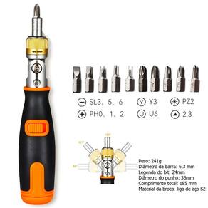 Chave Multifuncional Com 10 Bits Com Ajuste de ÂnguloChave de fenda portátil 10 em 1: Este conjunto de chave de fendainclui 10 Bits diferentes, tornando-se uma ferramenta versátil,permitindo o armazenamento e o transporte fáceis.Multi angular Capaz: A chave de fenda pode ser ajustada paradiferentes ângulos, facilitando o alcance de espaços e cantosapertados. Tipo da cabeça do parafuso do triângulo: O tipo dacabeça do parafuso do triângulo assegura um aperto seguro noparafuso, impedindo que deslize ou caia para fora.Especificação:Material do produto: Cromo vanádio vanádioProduto Tipo: Ratchet chaveAjuste de ângulo: 90° x 135° x 180°Tamanho: 185 × 30 × 30mmMadeidas:Fenda: 3.0 x 5.0 x 6.0Philips: PH0 x PH1 x PH2Fenda U: U6Triângulo: TA2.3Itens inclusos:1. (Um) Chave Multifuncional Com 10 Bits.