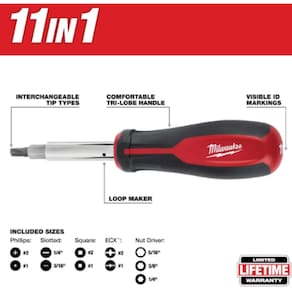 A chave de fenda 11 em 1 inclui as chaves de 8 bits e 3 porcas mais solicitadas pelos profissionais. A broca evita o desgaste da broca por parafusos endurecidos e prolonga a vida útil da broca ao apertar parafusos especiais encontrados em caixas elétricas, acopladores de conduítes, tomadas e outros acessórios comuns no local de trabalho.