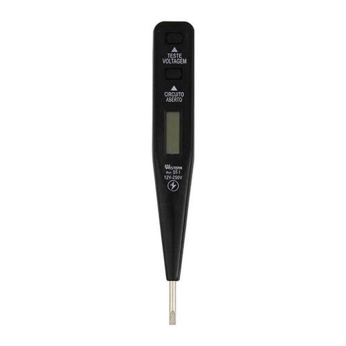 Chave Para Teste De Voltagem Westem Digital Preto Especificacao Tecnica - Caracteristicas: Facil de usar; Aperte o botao e confira a medicao no visor; Com clipe; Nao precisa de bateria; Voltagem: 12V - 250V. - Instrucoes de uso: Teste para medicao de 12V a 250V para corrente alternada e corrente continua, mede terra e fase; O condutor nao precisa estar descascado, basta apertar o botao. - Medicao direta: Encoste a ponta da chave teste no fio ou ponto de circuito que deseja medir e aperte o botao de medicao. O simbolo e o valor da tensao serao mostrados no display; Os digitos finais que aparecem, indica o valor aproximado de tensao medido; Se o valor medido estiver 70% abaixo do valor esperado, a chave teste ira mostrar o valor aproximado em sua escala interior. - Identificar tomada 220V: Coloque a ponta da chave teste nos dois orificios da tomada. O display devera indicar 110V para cada orificios. - Para medicao de tensao DC. Mantenha um dedo em contato com um dos polos de bateria e a ponta da chave teste em outro polo (0 display indicara valores a partir de 12V); O simbolo e o valor aproximado aparecerao no display. - Circuito aberto: O teste identifica se o condutor esta energizado; Basta aproximar a ponta da chave teste no fio eletrico encapado e ao pressionar o botao circuito aberto, no display LCD aparecera o simbolo, se ele estiver energizado. - Antes do uso: Verificar se o produto esta em perfeita condicoes de uso. - Cuidados: Nao utilize a ferramenta em locais umidos. Risco de choque eletrico. Para reduzir o risco de lesoes, sempre use adequadamente equipamentos de protecao individual (oculos de protecao, botas, mascara, luvas etc.) necessario ao trabalho; Atencao: Nao utilize para apertar parafusos; Em caso de duvidas, consulte um eletricista. A rede eletrica pode ser perigosa; Guarde em local seguro. - Advertencia/Antecao: Guarde estas instrucoes para futuras consultas; Manter fora do alcance das criancas. *Imagens meramente ilustrativas. Descricao