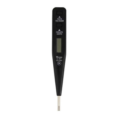 Descricao - Caracteristicas: Facil de usar; Aperte o botao e confira a medicao no visor; Com clipe; Nao precisa de bateria; Voltagem: 12V - 250V.- Instrucoes de uso: Teste para medicao de 12V a 250V para corrente alternada e corrente continua, mede terra e fase; O condutor nao precisa estar descascado, basta apertar o botao.- Medicao direta: Encoste a ponta da chave teste no fio ou ponto de circuito que deseja medir e aperte o botao de medicao. O simbolo e o valor da tensao serao mostrados no display; Os digitos finais que aparecem, indica o valor aproximado de tensao medido; Se o valor medido estiver 70% abaixo do valor esperado, a chave teste ira mostrar o valor aproximado em sua escala interior.- Identificar tomada 220V: Coloque a ponta da chave teste nos dois orificios da tomada. O display devera indicar 110V para cada orificios.- Para medicao de tensao DC. Mantenha um dedo em com um dos polos de bateria e a ponta da chave teste em outro polo (0 display indicara valores a partir de 12V); O simbolo e o valor aproximado aparecerao no display.- Circuito aberto: O teste identifica se o condutor esta energizado; Basta aproximar a ponta da chave teste no fio eletrico encapado e ao pressionar o botao circuito aberto, no display LCD aparecera o simbolo, se ele estiver energizado.- Antes do uso: Verificar se o produto esta em perfeita condicoes de uso.- Cuidados: Nao utilize a ferramenta em locais umidos. Risco de choque eletrico. Para reduzir o risco de lesoes, sempre use adequadamente equipamentos de protecao individual (oculos de protecao, botas, mascara, luvas etc.) necessario ao trabalho; Atencao: Nao utilize para apertar parafusos; Em caso de duvidas, consulte um eletricista. A rede eletrica pode ser perigosa; Guarde em .- Advertencia/Antecao: Guarde estas instrucoes para futuras consultas; Manter fora do alcance das criancas.*Imagens meramente ilustrativas.Especificacao Tecnica - Contem:- 1 Chave de teste de voltagem: 1,8 x 1,2 x 13cm (CxLxA)- Tipo de Embalagem: Blister- Dimensoes da Embalagem: 6 x 1,5 x 18cm (CxLxA)- Quantidade Inner: 24 Pecas- Dimensoes Inner: 18,5 x 17 x 7cm (CxLxA)- Quantidade Master: 240 Pecas- Dimensoes Master: 35 x 20 x 37cm (CxLxA)- Material: Plastico (ABS), Aco Carbono e Vidro.- Cor: Preto- Marca: Western