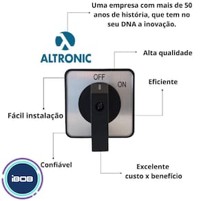 Características técnicas: Marca: altronic; Tensão nominal: 220-240v/ 380-440v; Corrente nominal: 63a; Posições: 2 posições; Tensão nominal de isolamento: 660v; Tipo de interruptor: chave rotativa.