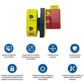 Principais características -desenvolvidas de acordo com a norma IEC60947-3 -atendem as exigências da norma NR12 -design moderno e compacto, para facilitar a instalação -completa linha de acessórios -proteção dos terminais classe IP20 -proteção frontal classe IP65 para manoplas Marca: Não Informado