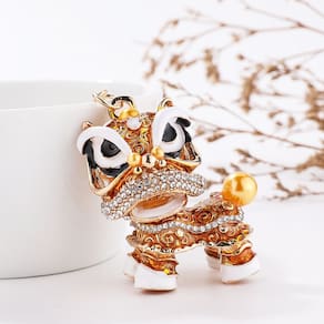 Material: liga: 3* 5 cm Peso: 65 g Design tradicional de dança do leão — Inspirado na dança cultural chinesa do leão, este chaveiro apresenta detalhes intrincados de esmalte e strass cintilantes, representando força e boa sorte. Artesanato em liga premium — Feito de liga de zinco durável com revestimento de ouro de alto brilho, garantindo cor, brilho e resistência duradouros ao desgaste. Acabamento requintado em strass — adornado com cristais finos que brilham lindamente sob a luz, aprimorando as características detalhadas do leão e a aparência festiva. Uso decorativo versátil — perfeito para prender às chaves do carro, bolsas, mochilas ou carteiras, adicionando um toque oriental elegante aos seus acessórios. Tamanho compacto e elegante — Medindo 3 × 5 cm e pesando 65 g, este chaveiro de leão é sólido e portátil, o que o torna um pingente sofisticado para o uso diário.