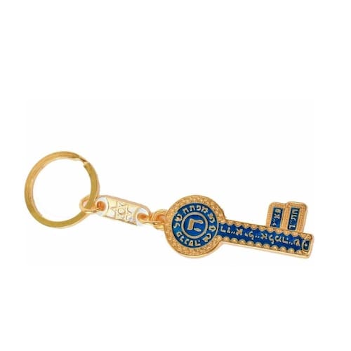 Chave de metal dourada esmaltada azul, escrito em hebraico, mafteach shel parnassá prosperidade/sustento na parte superior.