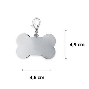 Descrição: chaveiro metálico de identificação para pets, dimensão 4,6 x 3 cm. Acompanha gancho.