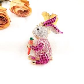 Material: liga e strass Tamanho: 7* 6 cm Peso: 50 g Lindo design de coelhinho — Apresenta um coelho deslumbrante segurando uma cenoura, decorado com strass rosa e transparente que brilham lindamente na luz. Materiais de alta qualidade — Fabricados com ligas duráveis e cristais premium, garantindo brilho duradouro e resistência ao desbotamento ou manchas. Acabamento dourado elegante — O metal dourado adiciona um toque luxuoso, tornando-o um acessório estiloso para o uso diário. Uso versátil — Perfeito para bolsas, chaves de carro, mochilas ou como uma peça marcante para expressar sua personalidade divertida e elegante. Leve e atraente — O tamanho compacto de 7 × 6 cm facilita o transporte e adiciona brilho e charme onde quer que você vá.