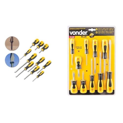 6 - Chaves de Fenda 1/8 x 2, 3/16 x 1.1/2 toco , 3/16 x 3, 1/4 x 1.1/2 toco , 1/4 x 4 e 5/16 x 6 4 - Chaves Phillips 1/8 x 2, 3/16 x 1.1/2 toco , 3/16 x 3 e 1/4 x 4 - Material do cabo: Polipropileno revestido com borracha termoplástica - Material do jogo de chave fenda e phillips: Aço cromo vanádio - Acabamento do jogo de chave de fenda e phillips: Niquelado - Cor do cabo da chave: Preto e amarelo - Massa aproximada peso : 0.61 kg