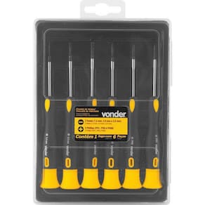 O Jogo Chave Fenda/Phillips Precisão 6Pcs Vonder 3570100060 é perfeito para quem busca qualidade e precisão em suas tarefas. Composto por um estojo plástico com 6 peças, sendo 3 fendas e 3 phillips, é indicado para relojoarias, eletrônicas, serviços de precisão e muito mais. As chaves de precisão possuem hastes em aço carbono cromado, garantindo durabilidade e resistência. Além disso, contam com cabo anatômico, que proporciona maior aderência e transmissão de força, facilitando o trabalho. Com tamanhos variados, as chaves fenda possuem medidas de 1,4 mm, 2,00 mm e 3,00 mm, enquanto as chaves phillips contam com as medidas ph1, ph0 e ph00. Com esse jogo, você terá todas as ferramentas necessárias para realizar suas tarefas com eficiência. Outro destaque desse jogo de chaves é o apoio superior giratório, que facilita a execução do trabalho, permitindo um manuseio mais prático e preciso. Com legal de 90 dias, você tem a tranquilidade de adquirir um produto de qualidade e confiável. Invista no Jogo Chave Fenda/Phillips Precisão 6Pcs Vonder 3570100060 e tenha em mãos todas as ferramentas necessárias para realizar suas tarefas com precisão e eficiência. Marca: Não Informado Ean: 7893946564759