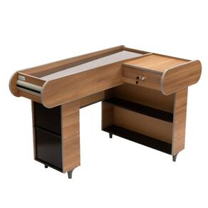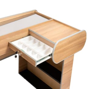 CARACTERÍSTICAS . corredor Padrão o ATENDENTE assenta a direita passa produtos a esquerda . gaveta com chave e porta notas divisão para notas e moedas . 4 prateleiras internas . espaço para caixa registradora ou balança . fixação lateral com parafuso