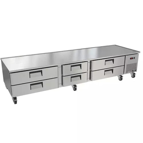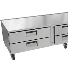 Equipado com rodízios resistentes e travas, o Chef Base permite fácil deslocamento, e as corrediças das gavetas com rolamentos blindados garantem abertura suave e durável. Acompanha cestos perfurados e divisórias para cubas padrão 1/3, 1/2 e 1/1, proporcionando máxima versatilidade no armazenamento.