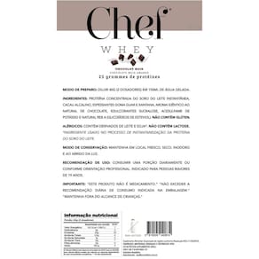 chef whey protein é um suplemento de whey protein gourmet, excelente para atletas e praticantes de atividades físicas que buscam por construção, manutenção e recuperação muscular. Utiliza como fonte de proteína whey protein concentrado zero lactose, a forma mais pura de whey protein que existe. Assim, cada porção de chef whey protein da chef whey contém 25g da mais pura proteína para ganho de massa muscular por dose. Possui o mais alto valor biológico da proteína e a maior capacidade de absorção pelo organismo, além de ser rico em aminoácidos essenciais como o bcaa, elemento diretamente ligado ao aumento da massa muscular magra e à reconstrução dos músculos. Benefícios: tem ação antioxidante; zero lactose; ideal para quem busca o e/ou definição; auxilia no ganho de massa muscular; fortalece o sistema imunológico; auxilia na manutenção e recuperação muscular; equilíbrio do nitrogênio; proteínas de qualidade; alta concentração de bcaa por dose; alto teor de leucina; 25 g de proteínas por dose; não contém glúten; baixa quantidade de carboidratos; auxilia na recuperação muscular. Como tomar: misture 35g dois medidores completo em 150ml de água. Consumir uma porção diariamente ou conforme orientação de um nutricionista ou médico.