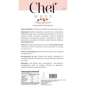 chef whey protein é um suplemento de whey protein gourmet, excelente para atletas e praticantes de atividades físicas que buscam por construção, manutenção e recuperação muscular. Utiliza como fonte de proteína whey protein concentrado zero lactose, a forma mais pura de whey protein que existe. Assim, cada porção de chef whey protein da chef whey contém 25g da mais pura proteína para ganho de massa muscular por dose. Possui o mais alto valor biológico da proteína e a maior capacidade de absorção pelo organismo, além de ser rico em aminoácidos essenciais como o bcaa, elemento diretamente ligado ao aumento da massa muscular magra e à reconstrução dos músculos. Benefícios: tem ação antioxidante; zero lactose; ideal para quem busca o e/ou definição; auxilia no ganho de massa muscular; fortalece o sistema imunológico; auxilia na manutenção e recuperação muscular; equilíbrio do nitrogênio; proteínas de qualidade; alta concentração de bcaa por dose; alto teor de leucina; 25 g de proteínas por dose; não contém glúten; baixa quantidade de carboidratos; auxilia na recuperação muscular. Como tomar: misture 35g dois medidores completo em 150ml de água. Consumir uma porção diariamente ou conforme orientação de um nutricionista ou médico. Marca: Suplementos Br